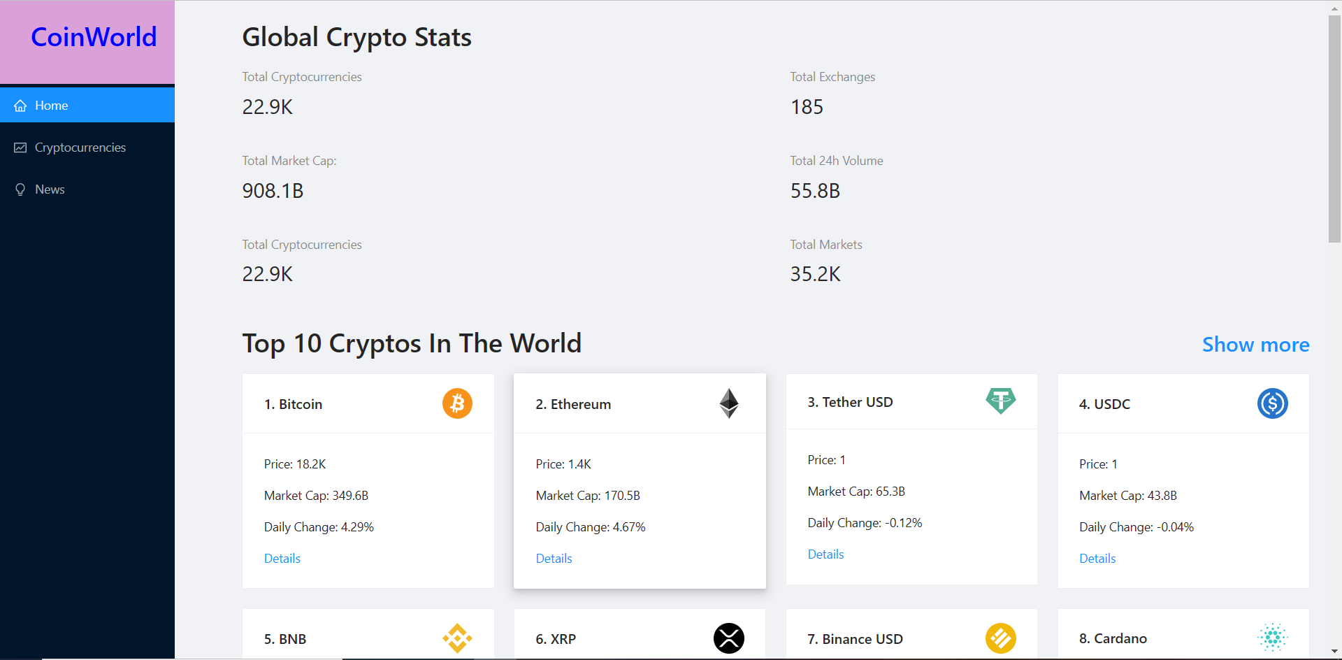 Implemented a coinworld which gives the data of all cryptocurrencies its prices,its market valuation and daily changes it gives the trending graph of various currencies and various news related to crypto